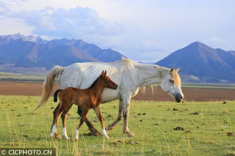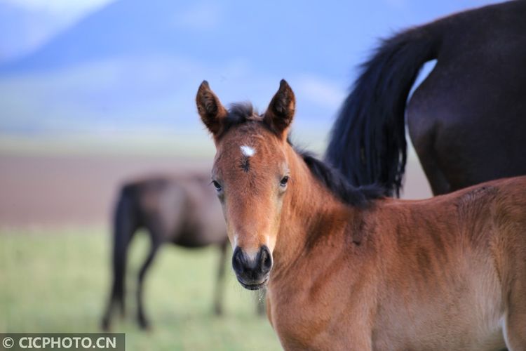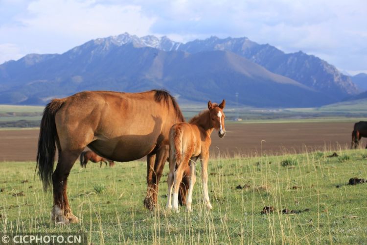 ↑6月4日,在位于祁连山下的甘肃山丹马场,成年母马在照料刚刚产下的小马驹。CICPHOTO/王超 摄