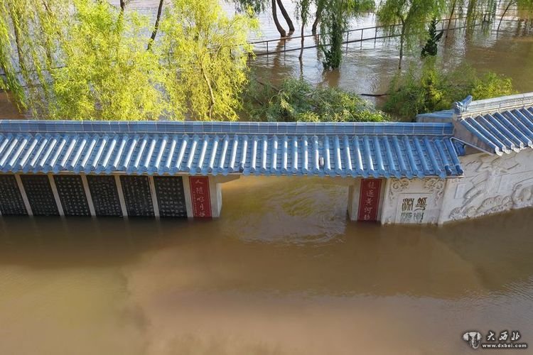 7月13日,黄河兰州段沿岸的兰州水车博览园内部分设施被淹(无人机拍摄)。新华社记者范培珅摄