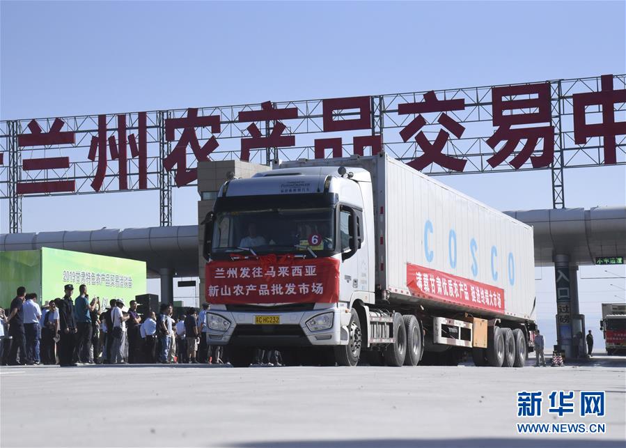 7月25日,一辆载有运往马来西亚新山农产品批发市场货物的货车,驶出兰州农产品交易中心。 新华社记者 张睿 摄