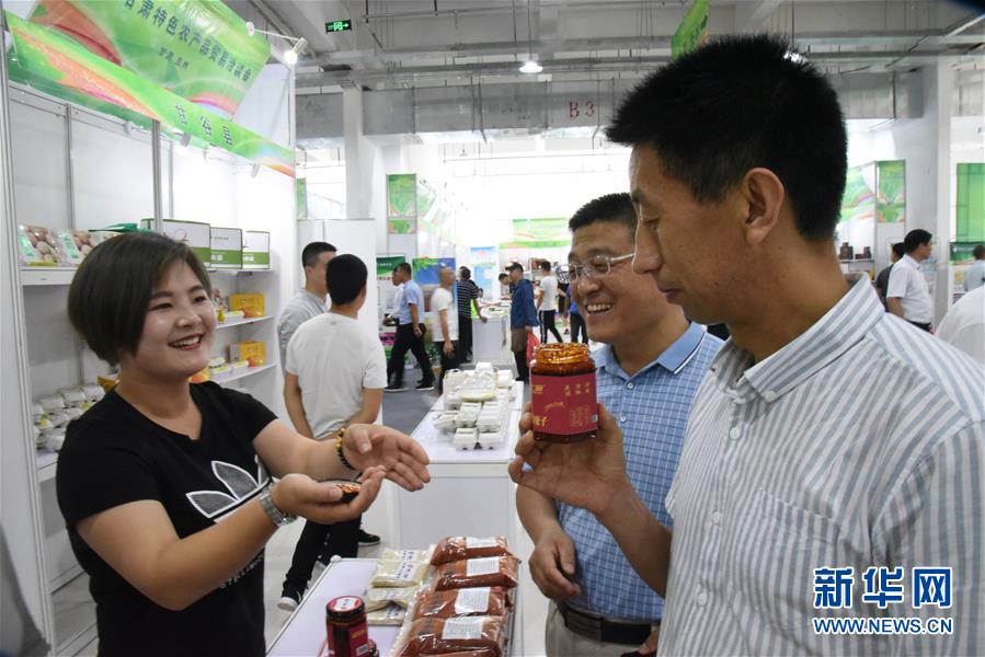 7月25日,来自甘肃天水甘谷县参展企业的工作人员在洽谈会上向人们介绍特产辣椒。新华社记者 张睿 摄