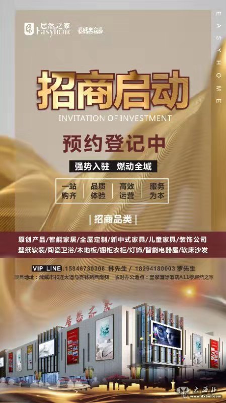 居然之家武威店目前在已进入招商筹备阶段,预计将于2020年元旦左右盛装亮相,集家具、建材、装饰于一身的一流家居商场将华丽登场,必将进一步提升武威家居业态水平,并为广大消费者提供更多更优质的产品与服务,请大家拭目以待!