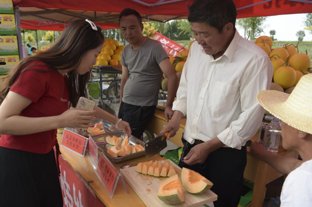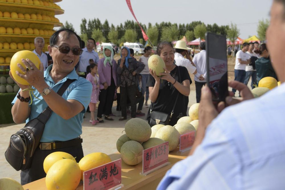 蜜瓜节开始喽!来自甘肃省民勤县收成镇宙和村的村民谢金萍,忙着把麻袋里一个个金灿灿、圆滚滚的蜜瓜拿出来摆在销售展台上,她笑着向游客和客商们介绍:“这几年瓜品种多,这个叫‘金元帅’,甜得很哩。”