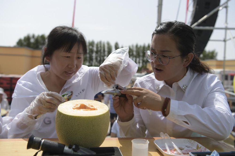 蜜瓜节“瓜王”评选大赛上,技术员对蜜瓜甜度进行检测。新华社发(马希平摄)