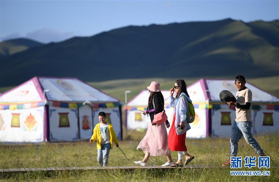 游客在甘肃省甘南藏族自治州碌曲县尕海镇尕秀村帐篷城度假区游玩(2018年8月10日摄)。新华社记者 陈斌 摄
