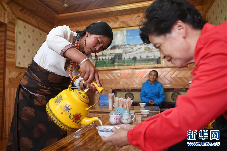 甘肃省甘南藏族自治州碌曲县尕海镇尕秀村村民扎西拉毛(左)在自家的牧家乐里为游客倒奶茶(2018年8月10日摄)。新华社记者 陈斌 摄