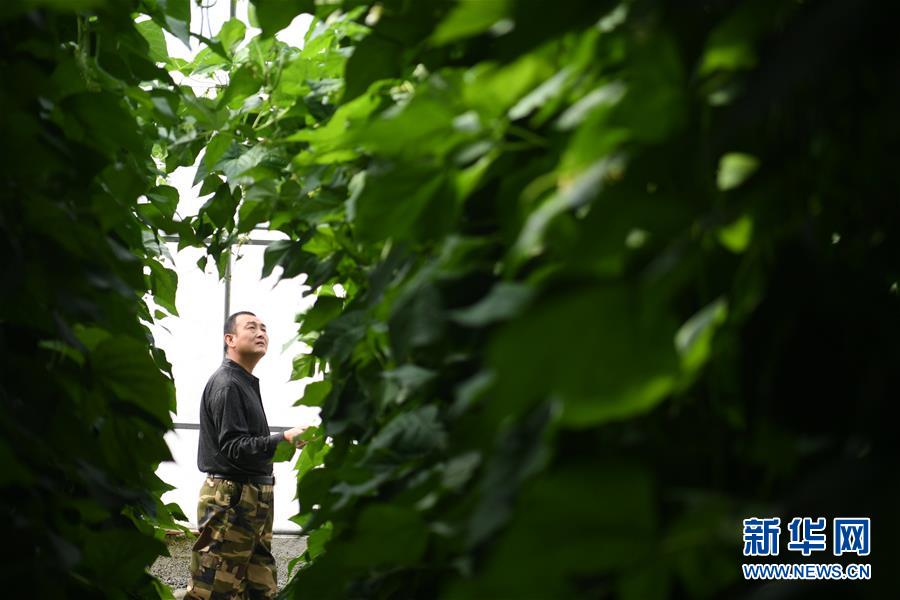 甘肃省酒泉市肃州区总寨镇村民范立德在戈壁农业产业园的日光温室内查看蔬菜生长情况(2018年4月18日摄)。新华社记者 陈斌 摄