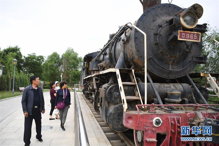 游客在甘肃省白银市火焰山国家矿山公园内参观蒸汽机车(2019年6月11日摄)。新华社记者 陈斌 摄
