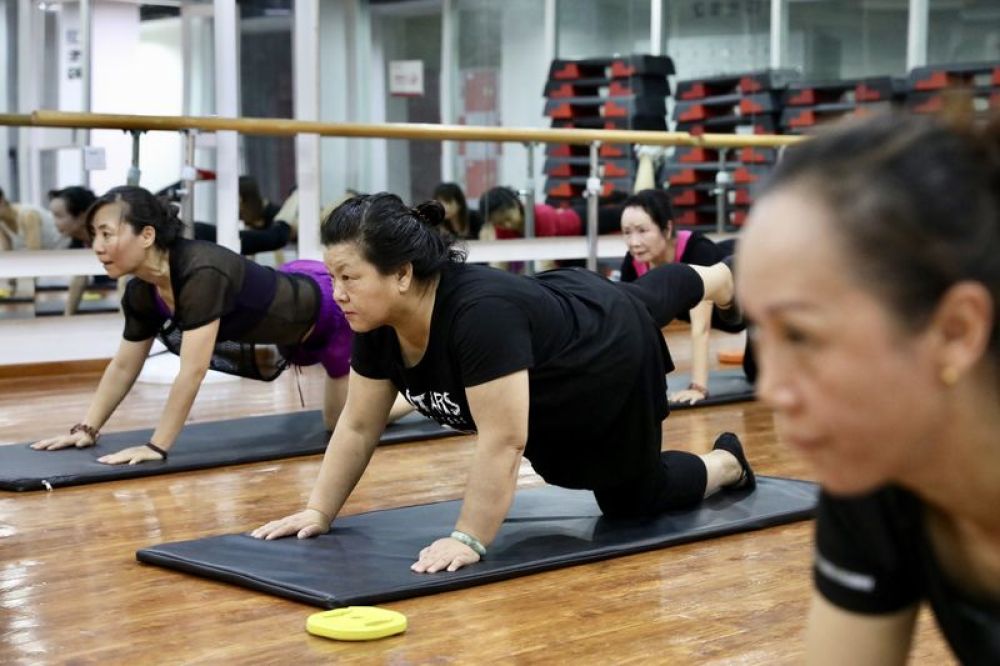 “只要坚持健身,就不老。”说罢,俩人系紧发束,笑着去准备下一堂团体操课。
