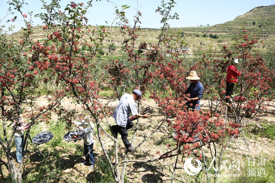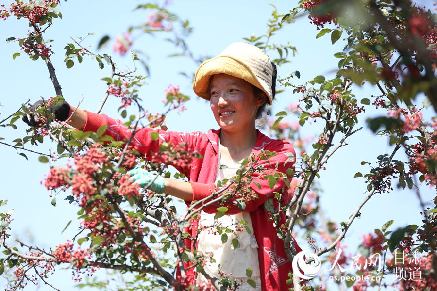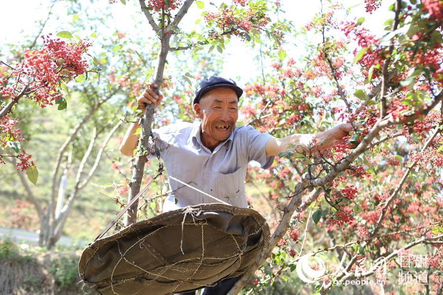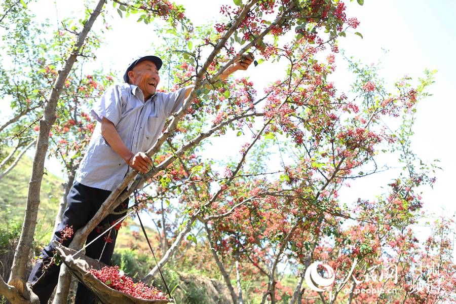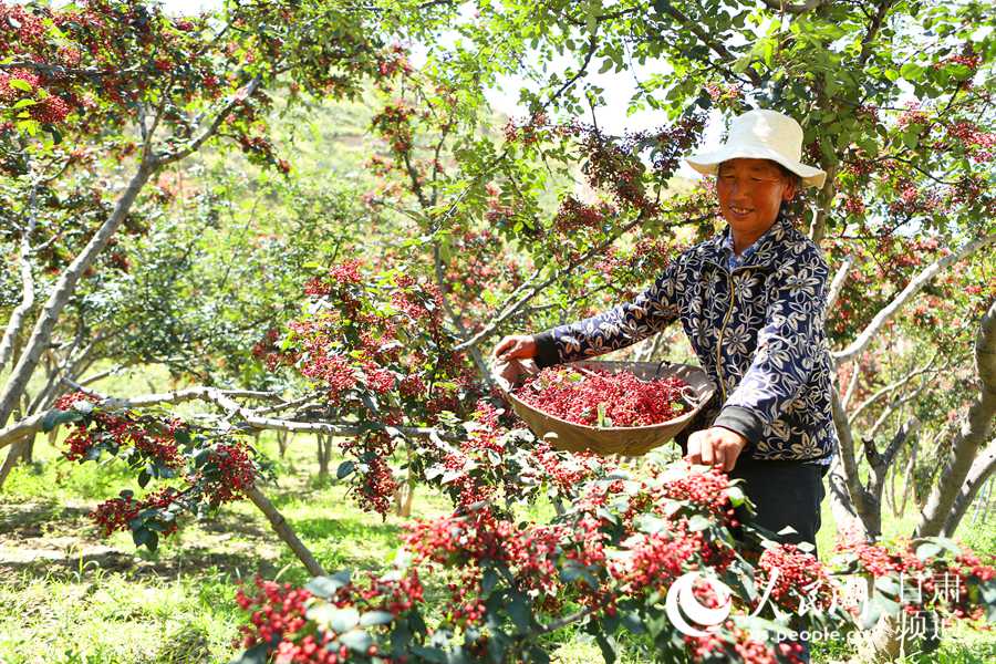 花椒种植也成为“两户见面会”的重要“议题”。在当地政府部门提供技术支持的基础上,该县多个乡镇交流种植花椒经验,扩大种植面积。目前,该县花椒种植面积约30万亩,盛产期亩均产出效益近3万元,带动15个乡镇、85个行政村百姓增收致富。目前,该县花椒年产量约400万公斤,可实现产值29000万元,人均花椒收入约1096元,主产区人均花椒收入超过4000元,花椒产业已成为当地百姓脱贫致富奔小康的主导产业。(图为积石山县土族百姓正在采摘花椒。)