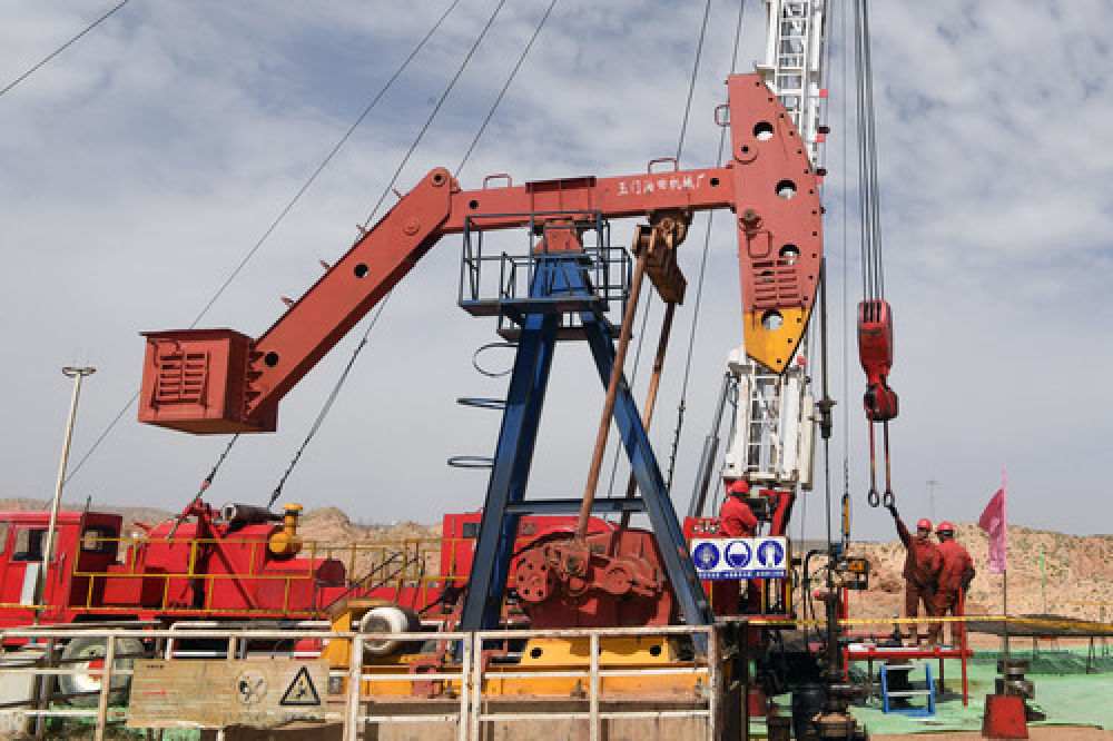 在玉门油田老君庙采油厂,修井工人检修油井(8月16日摄)。新华社记者范培珅摄