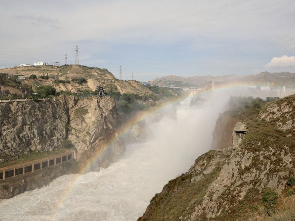 7月10日,刘家峡水库正在泄洪,水如白练,彩虹跨于其上。新华社记者张玉洁摄(资料图片)