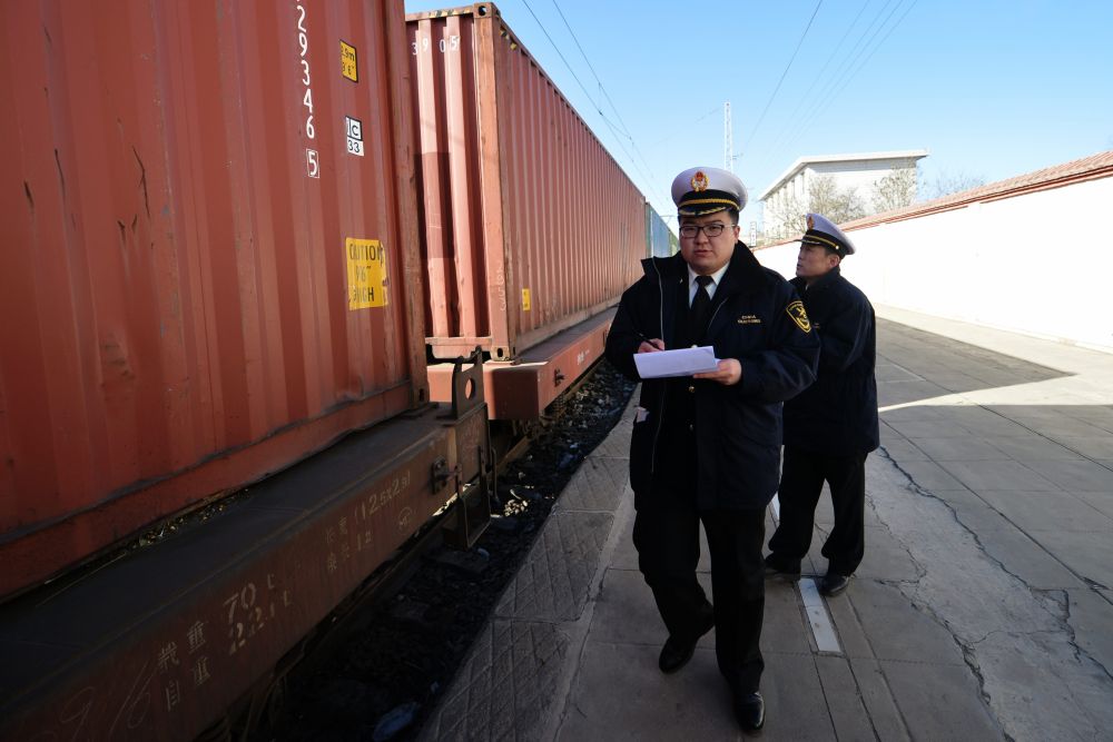 两名海关工作人员在“天马号”开车前检查登记。中欧国际货运班列“天马号”从甘肃武威南车站出发,开始了前往哈萨克斯坦阿拉木图、全程约2646公里的首发行程。新华社记者陈斌摄(资料图片)