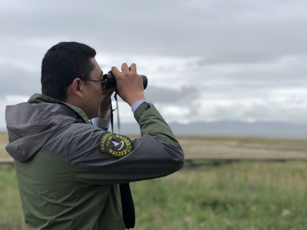 范龙观察尕海湿地保护情况。新华社记者张文静摄