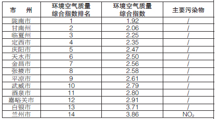 9月份,全省14个城市环境空气质量综合排名由好到差分别为陇南、甘南、临夏、定西、庆阳、天水、金昌、张掖、平凉、武威、酒泉、嘉峪关、白银、兰州。
