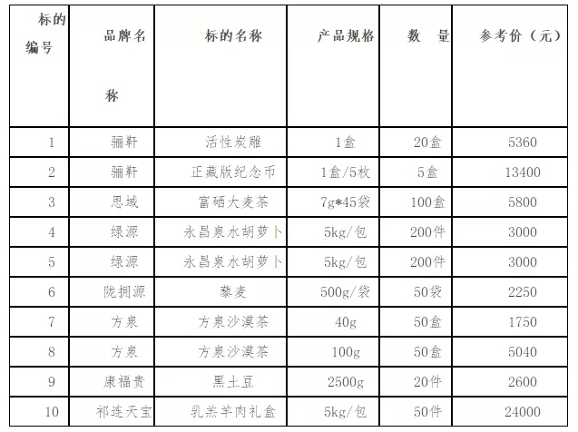 主要拍卖产品包含:永昌泉水胡萝卜、藜麦、方泉沙漠茶、富硒大麦茶、乳羔羊肉礼盒、黑土豆、活性炭雕、正藏版纪念币。