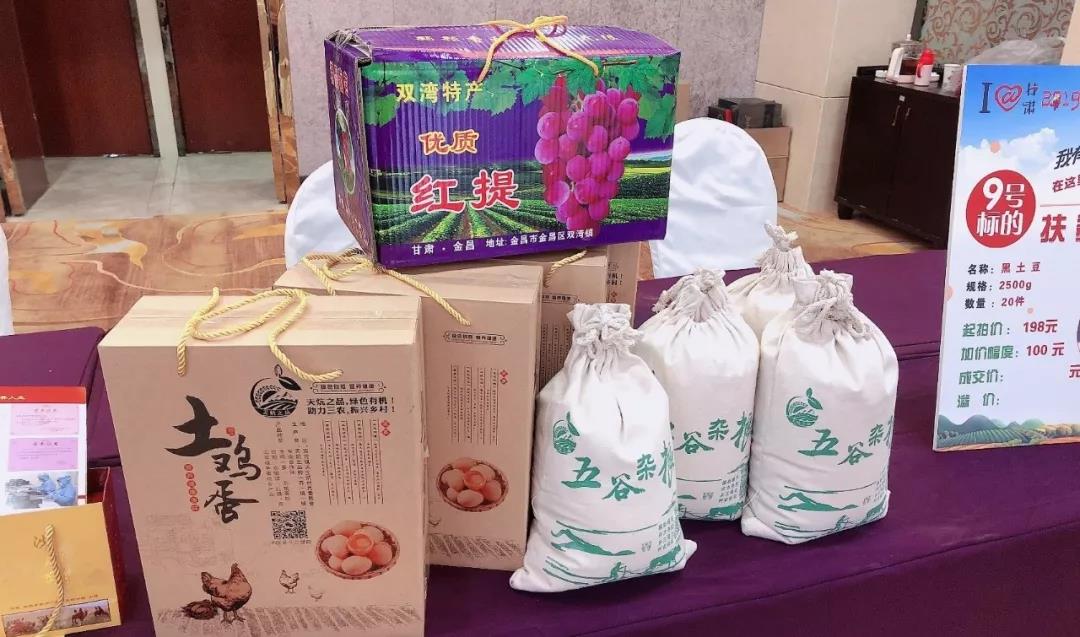本次公益拍卖标的物分别是:永昌泉水胡萝卜、富硒大麦茶、活性炭雕、珍藏版纪念币、藜麦、方泉沙漠茶、黑土豆、乳羔羊肉礼盒特色农产品,并在线上线下同时开展扶贫公益拍卖活动。7家电商企业牵头组织10个标的特色产品,以超低成本价起拍,其中热点传媒、震藩农牧、里森商贸、京智优选等企业采取1元起拍方式,将拍卖溢价资金全部用于支持金昌扶贫事业。
