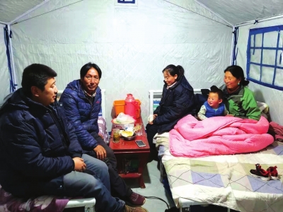 10月28日,夏河县达麦乡受灾群众贡保当知一家在安置帐篷里用上了电褥子。新华社照片