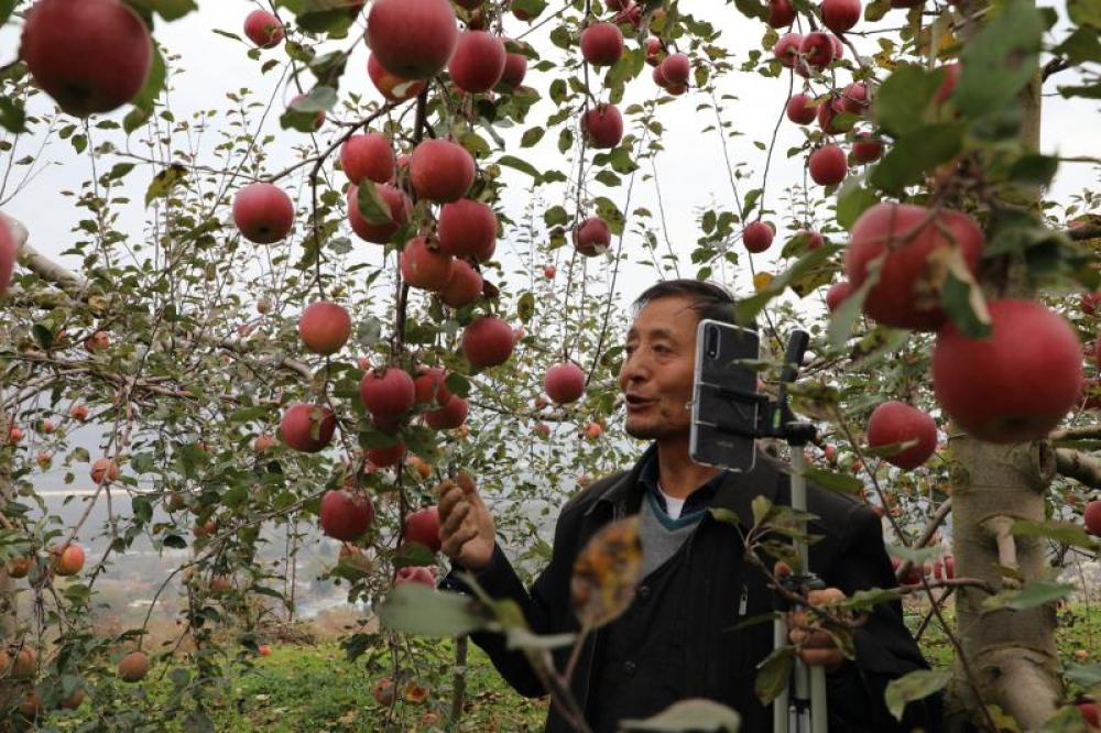 “宝宝们好!你们看,这是我家今年最后的苹果。”58岁的村民张加成一把拽下红扑扑的果子送到嘴边,津津有味地边咀嚼边说道,“这些苹果还在树上给大家保存着,是专门给你们‘双十一’采购准备的。”
