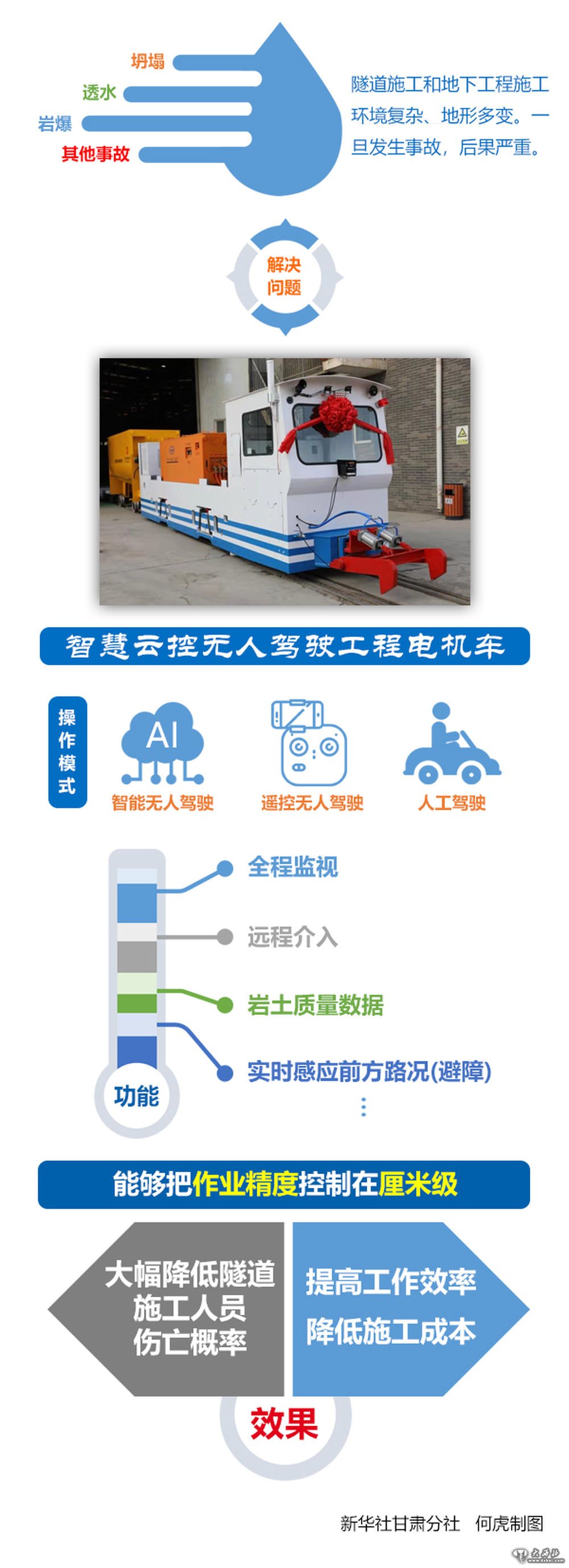 新华社兰州11月13日电(记者崔翰超)“滴、滴、滴”,随着三声清脆的鸣笛声,12日下午,智慧云控无人驾驶工程电机车在位于甘肃省兰州市的中车兰州机车有限公司正式下线。科研人员表示,这项新技术把人工智能和无人驾驶技术结合起来,将主要用于复杂环境下的施工,可接替部分隧道施工和地下工程的危险工作,大幅降低隧道施工人员伤亡概率,并能提高工作效率,降低施工成本。