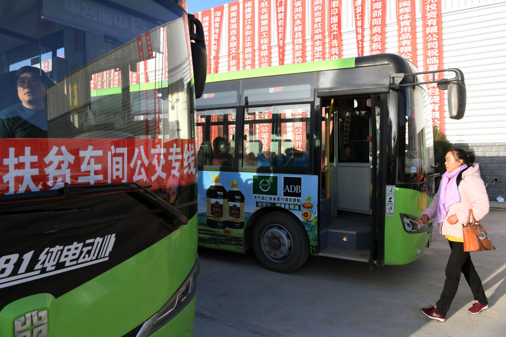 11月14日,和政县吉美包袋生产基地扶贫工厂的职工在下班后准备乘坐公交专线车回家。新华社记者马宁摄