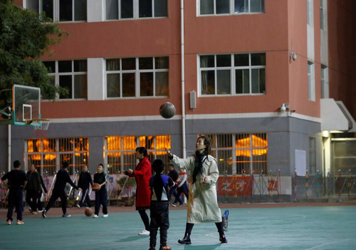 市民在兰州市西固区玉门街小学体育场内打篮球。新华社记者 杜哲宇 摄