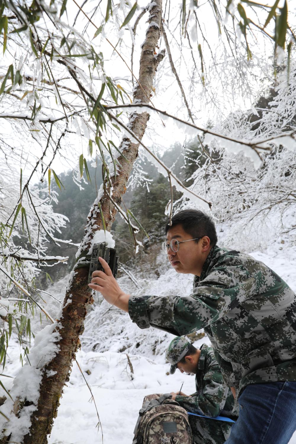 12月13日,巡护员许可(上)和张雄在检查已安装红外相机的工作情况。新华社发(杜哲宇摄)