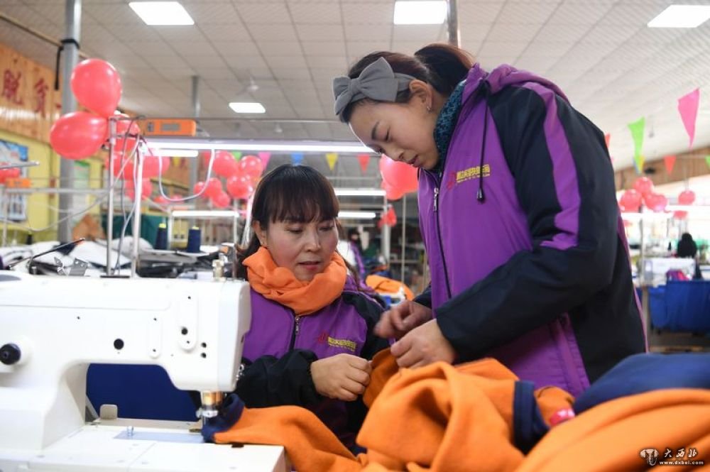 1月9日,在甘肃省甘谷县六峰镇六峰村扶贫车间,程春霞(右一)检查服装质量。新华社记者范培珅摄