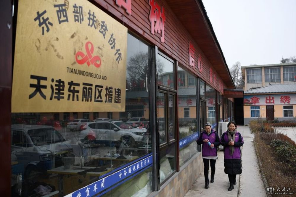 1月9日,在甘肃省甘谷县六峰镇六峰村扶贫车间,程春霞(左)和车间负责人姜小珍在车间外交谈。新华社记者范培珅摄