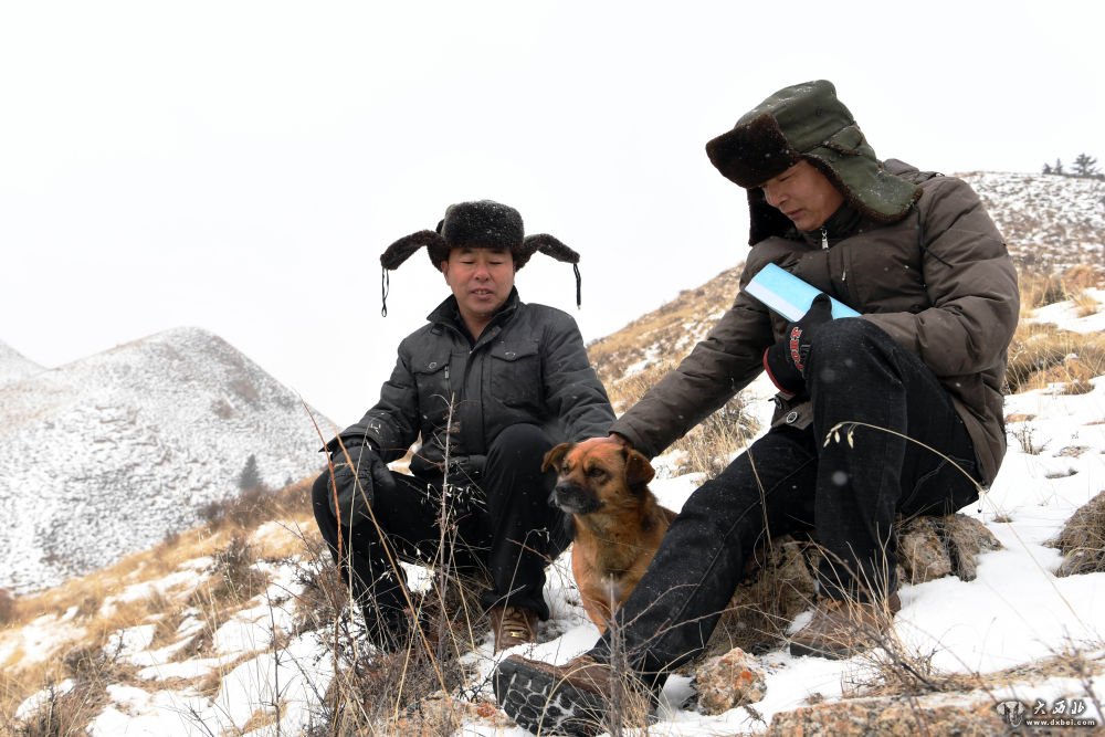 1月15日,三岔资源管护站护林员冯德俊(右)、张得团在巡山途中和“小黄”一起休息。新华社记者马宁摄