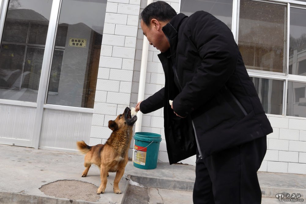 1月15日,护林员张得团在三岔资源管护站给巡山归来的“小黄”喂食。新华社记者马宁摄