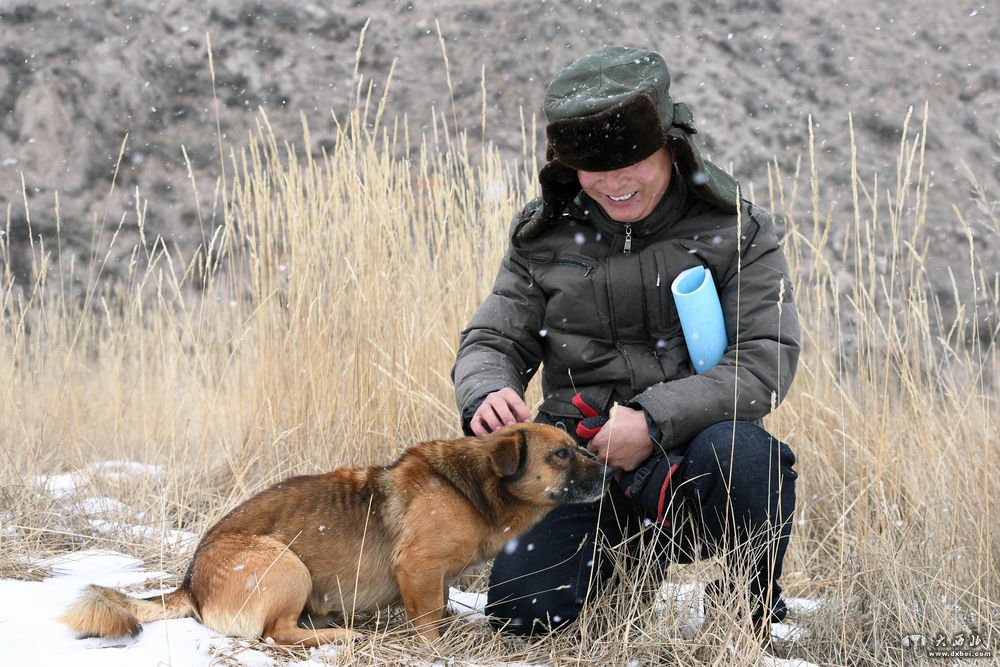 1月15日,三岔资源管护站护林员冯德俊在巡山途中和“小黄”玩耍。新华社记者马宁摄