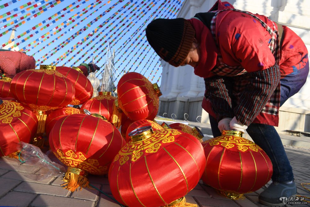 1月13日,工作人员在白塔寺灯会现场布置彩灯。新华社记者马宁摄