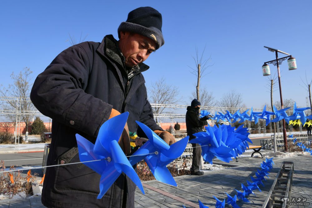 1月13日,工作人员在白塔寺灯会现场布置风车。新华社记者马宁摄