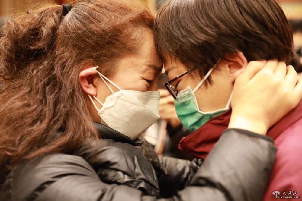 2月4日,甘肃省第二人民医院骨科主管护师谭锦柯(右)在出发前和丈夫王海默告别,王海默也是甘肃省第二人民医院的一位医生。