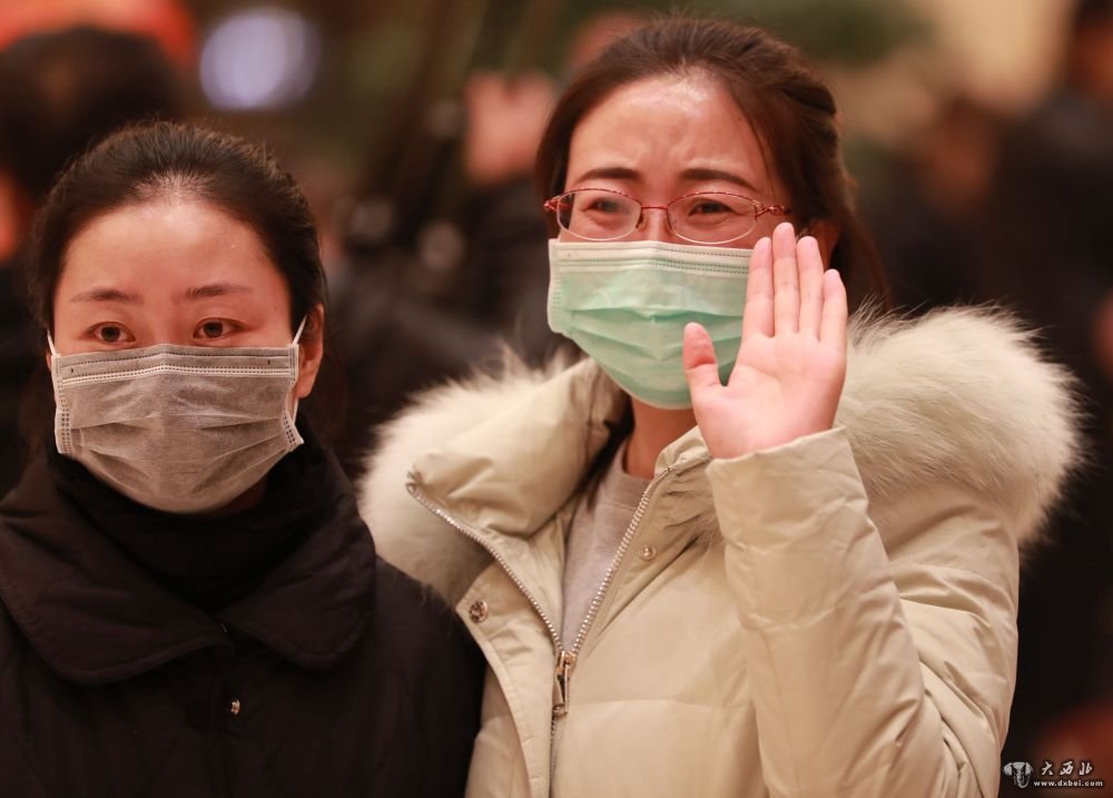 2月4日,甘肃省肿瘤医院主管护师董慧敏(右)在出发仪式上和同事告别。新华社发(杜哲宇摄)