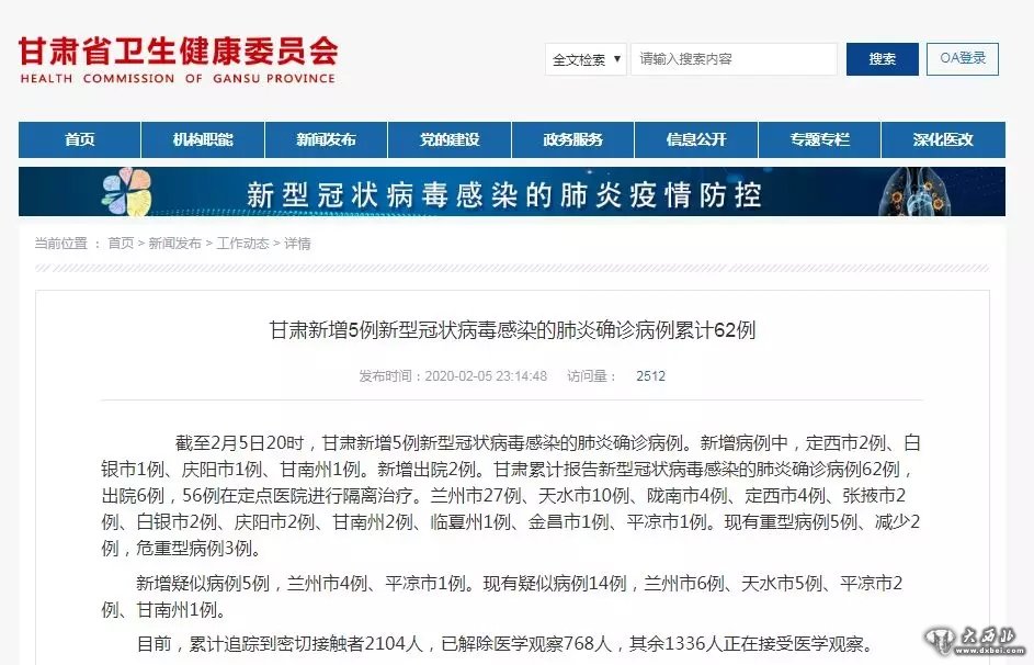 甘肃省卫健委2月5日通报称,截至2月5日20时,甘肃新增5例新型冠状病毒感染的肺炎确诊病例。新增病例中,定西市2例、白银市1例、庆阳市1例、甘南州1例。新增出院2例。甘肃累计报告新型冠状病毒感染的肺炎确诊病例62例,出院6例,56例在定点医院进行隔离治疗。兰州市27例、天水市10例、陇南市4例、定西市4例、张掖市2例、白银市2例、庆阳市2例、甘南州2例、临夏州1例、金昌市1例、平凉市1例。现有重型病例5例、减少2例,危重型病例3例。