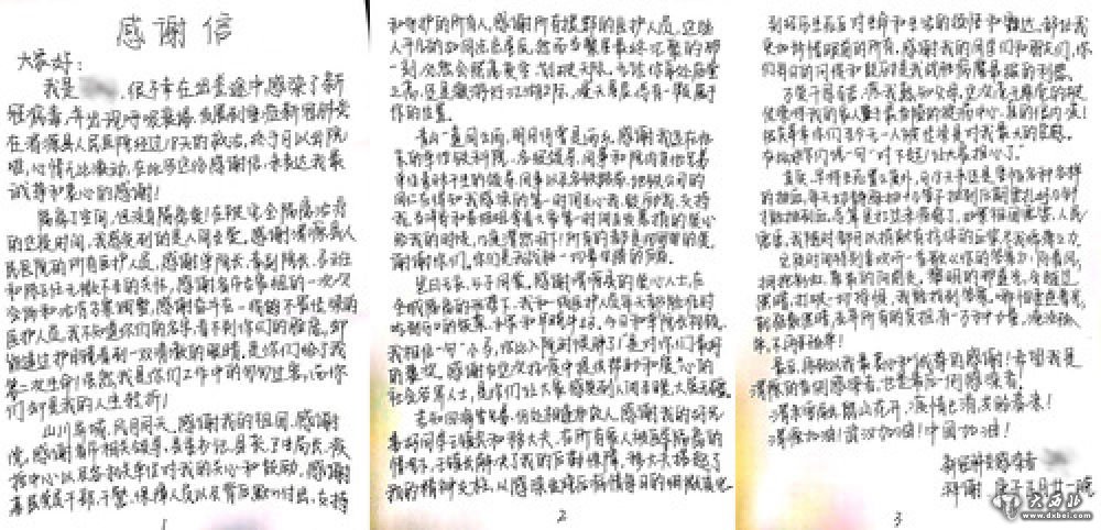 “我不知道你们的名字,看不到你们的脸庞,却能透过护目镜看到一双清澈的眼睛,是你们给了我第二次生命!虽然我只是你们工作中的匆匆过客,而你们却是我的人生转折!”2月15日,32岁的新冠肺炎确诊重症患者马明(化名)在经过18天的救治后,走出甘肃省定西市渭源县人民医院。出院前,他将自己手写的一封感谢信,心怀感恩地交给了医护人员。