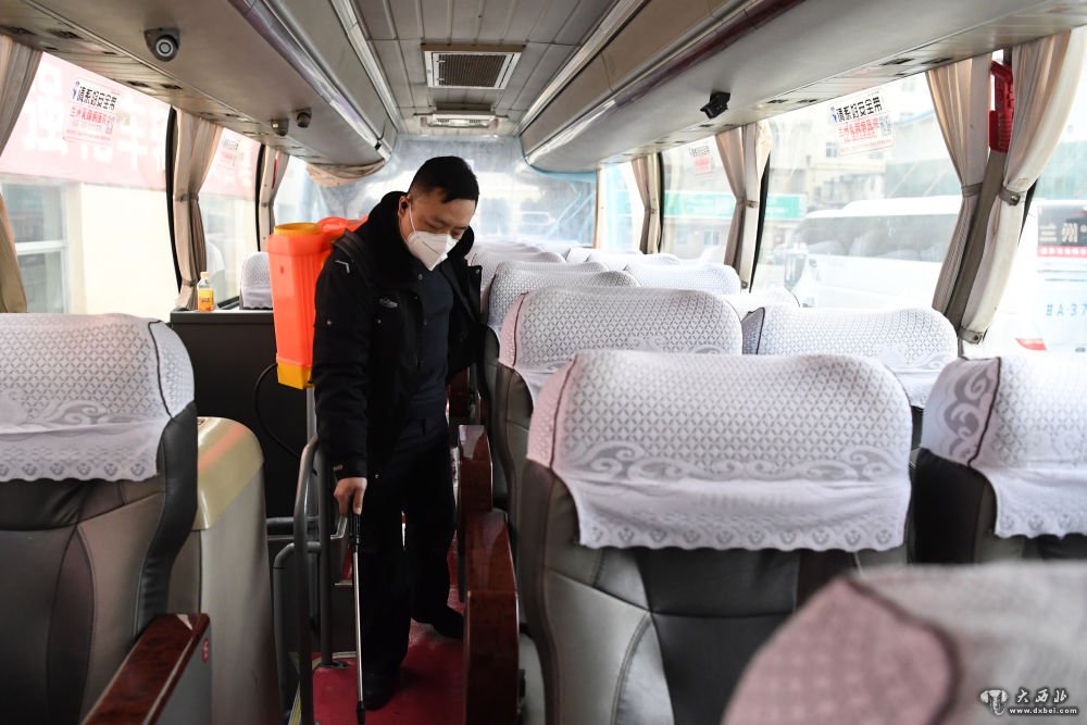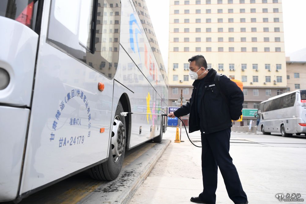 2月20日,兰州客运中心一名工作人员对完成客运任务的班车消毒。新华社记者陈斌摄