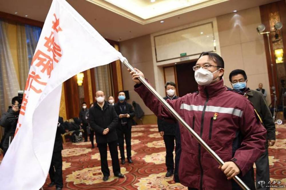 甘肃省第一批援助湖北医疗队队长蔡辉(前)在出发仪式上接过医疗救治队队旗。新华社记者陈斌摄
