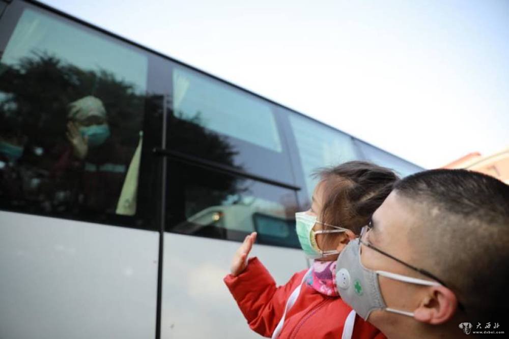 甘肃省第四批援助湖北医疗队队员的家属挥手送别亲人。新华社发(杜哲宇摄)