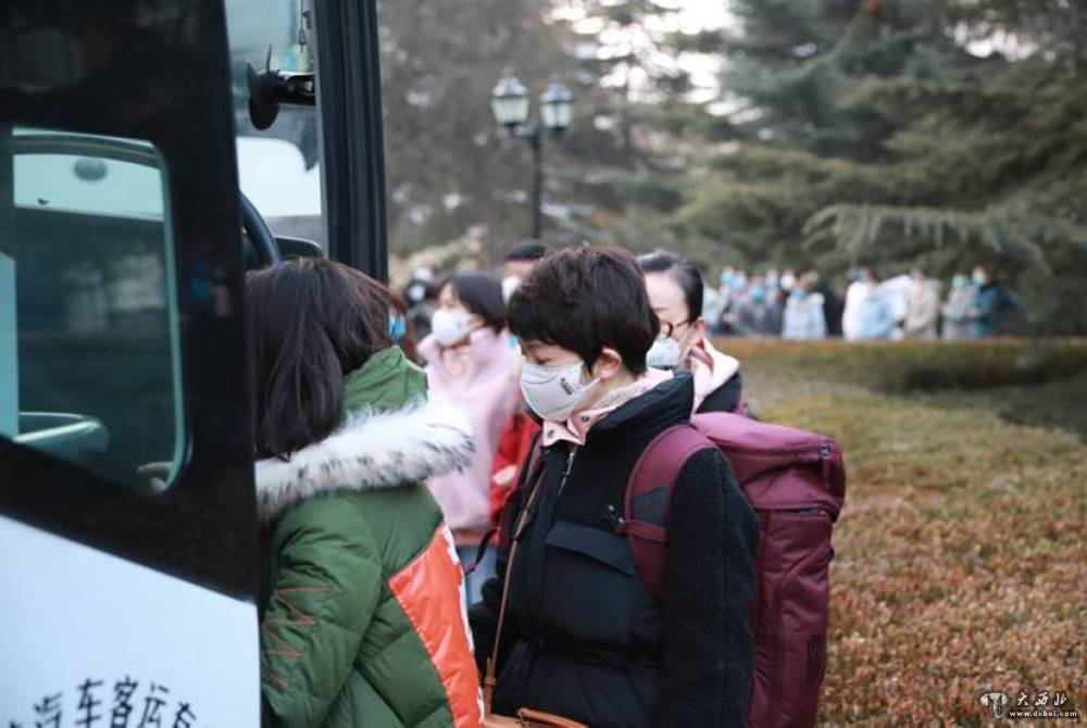 甘肃省第一批援助湖北医疗队的医护人员登上大巴前往兰州中川国际机场。新华社发(杜哲宇摄)