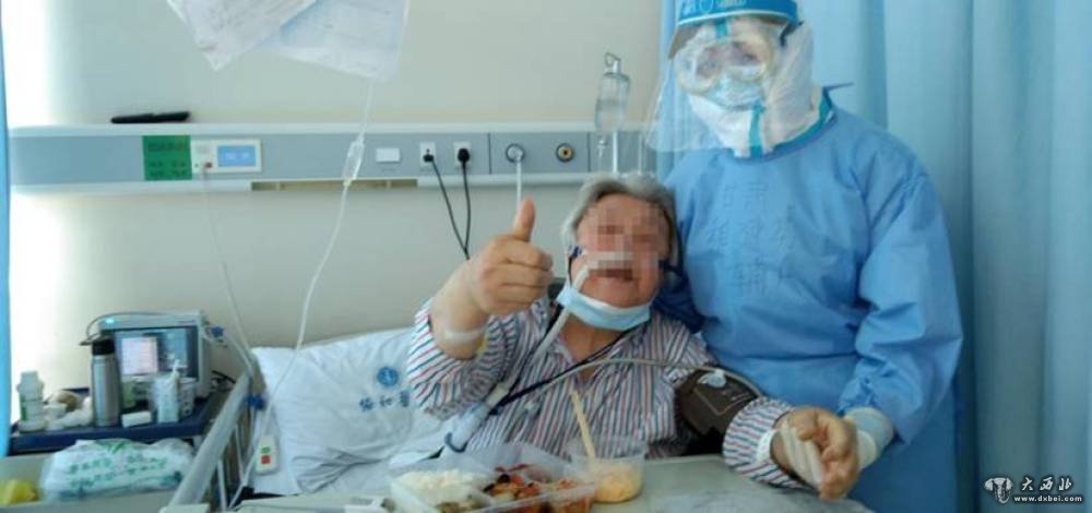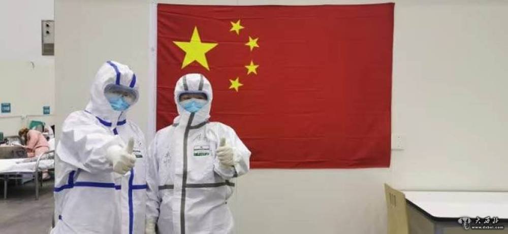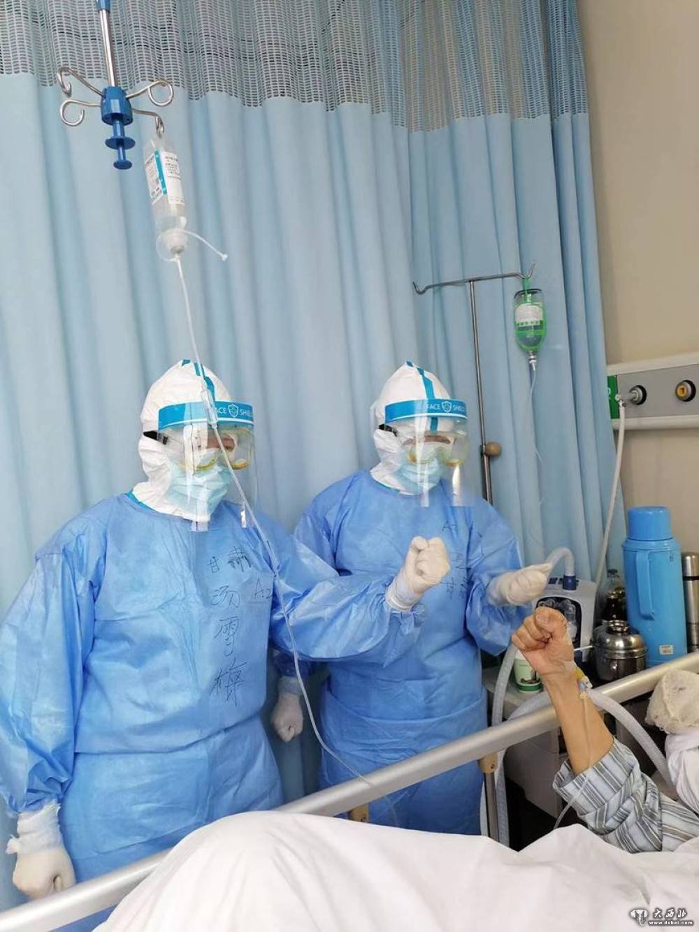 甘肃省第一批援助湖北医疗队队员、甘肃省人民医院医务人员伍严骏(右)和汤雪梅从武汉中心医院后湖院区转战武汉协和医院西院区后在病房给患者加油鼓劲。(甘肃省人民医院供图)