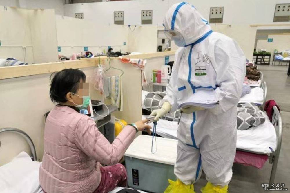 甘肃省第二批援助湖北医疗队队员、临泽县人民医院副主任护师王晓梅正在给患者测血氧。(临泽县人民医院供图)