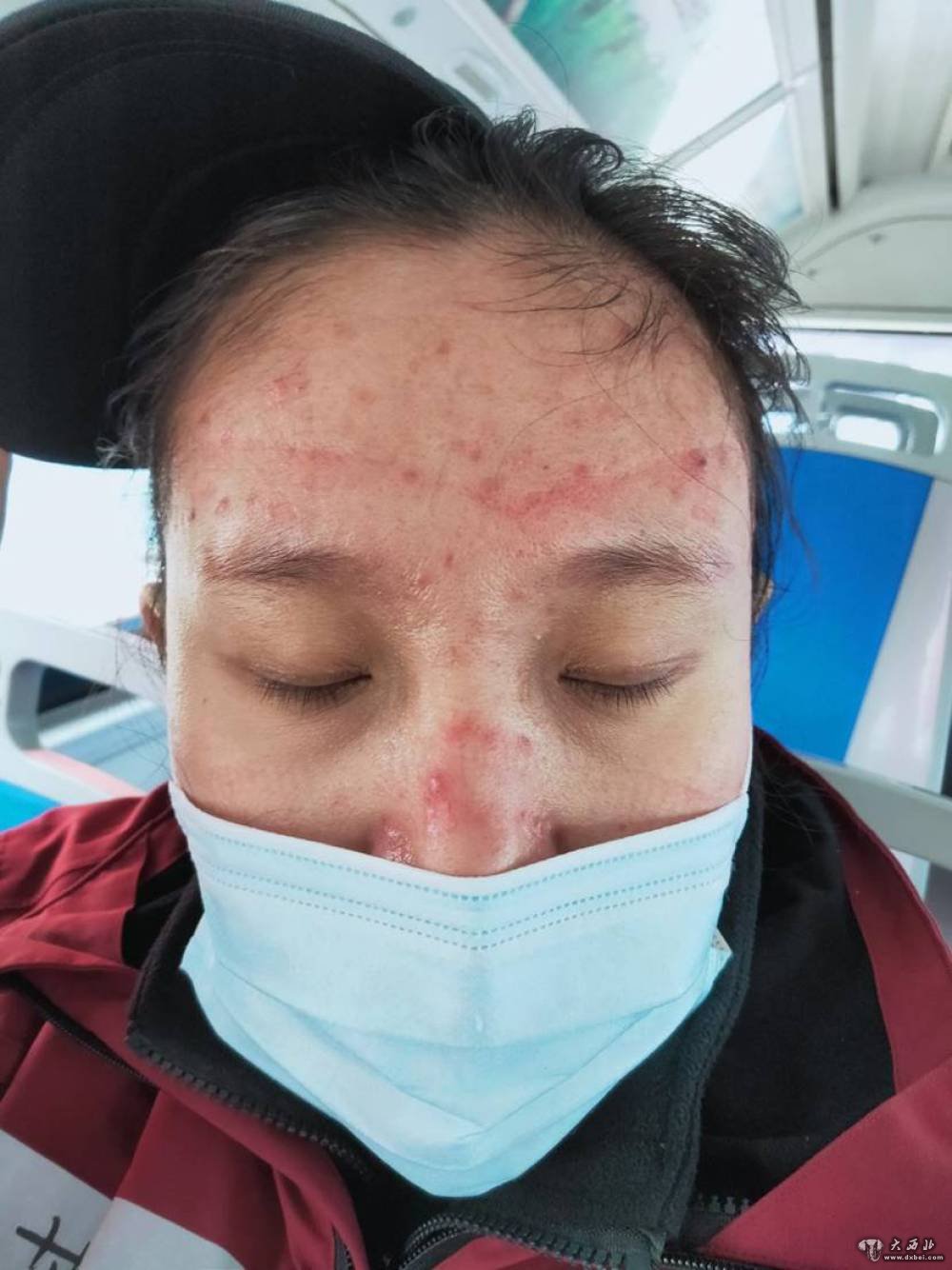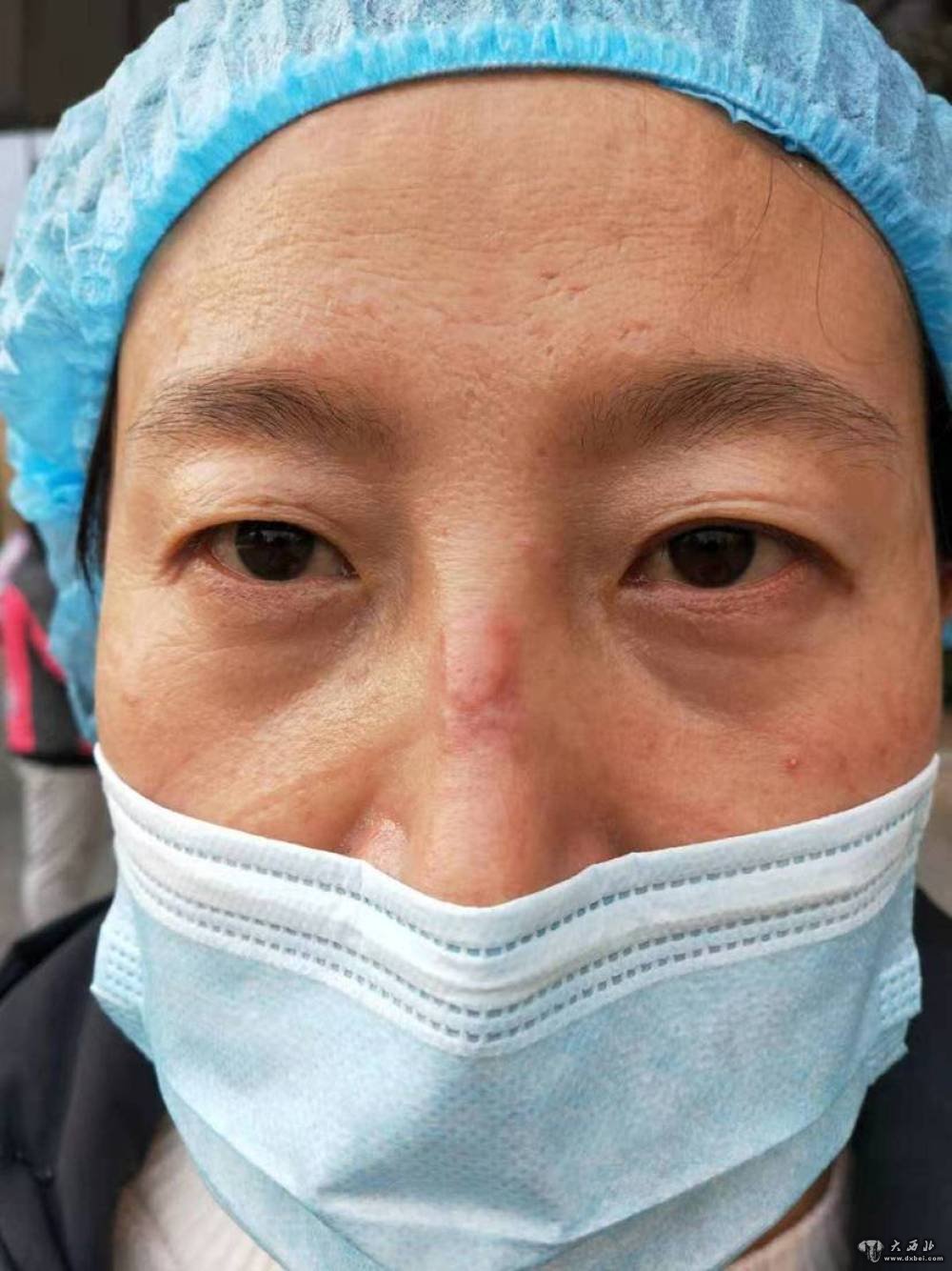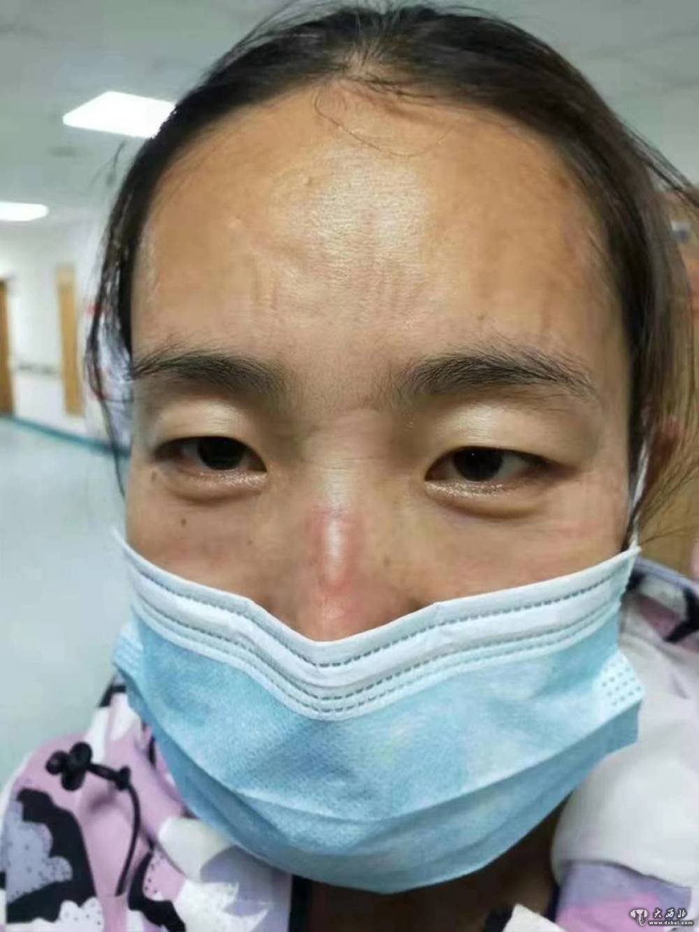 甘肃省金昌市中心医院护士许玉晶在抗疫一线因为长期佩戴护目镜鼻梁磨出了水泡。(金昌市中心医院供图)