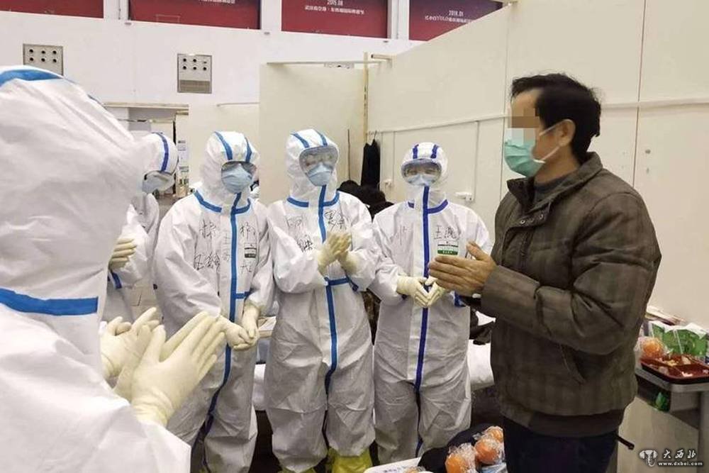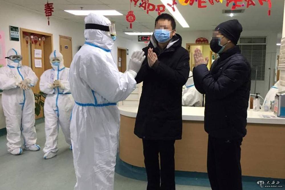 甘肃省第一批援助湖北医疗队队员、甘肃省人民医院主任医师虎维东(前左一)在武汉中心医院后湖院区与治愈患者交流。(甘肃省人民医院供图)