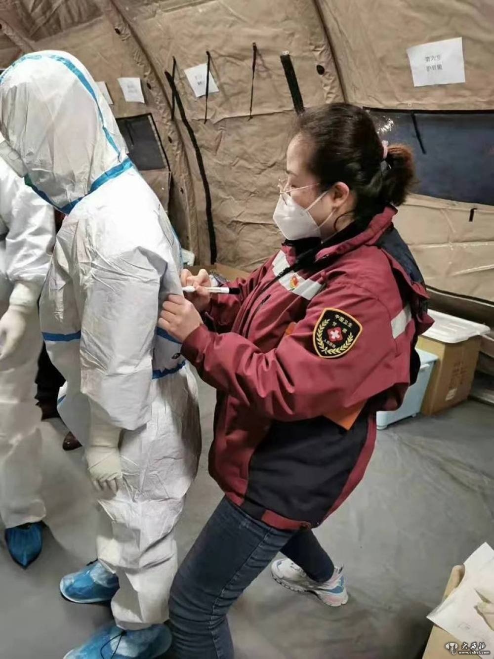 右图:甘肃省第一批援助湖北医疗队队员、甘肃省肿瘤医院医务人员杨明霞在武汉中心医院后湖院区开展工作。(甘肃省肿瘤医院供图)