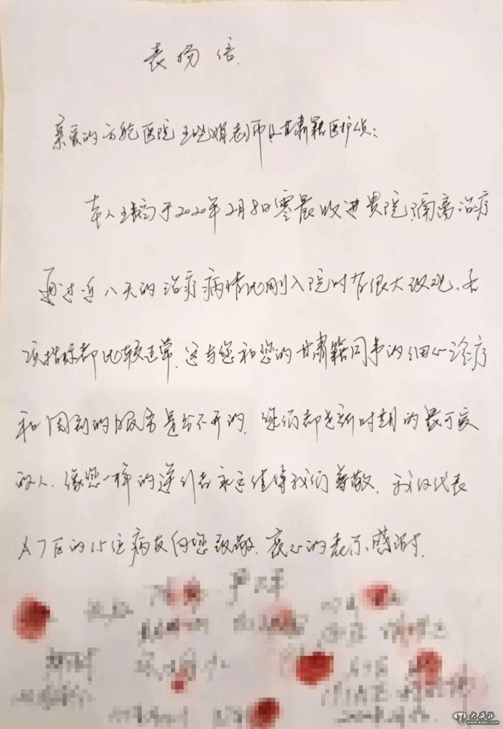 这是武汉城市客厅方舱医院多位患者联名写给甘肃省第二批援助湖北医疗队队员的表扬信。(甘肃省第二批援助湖北医疗队供图)