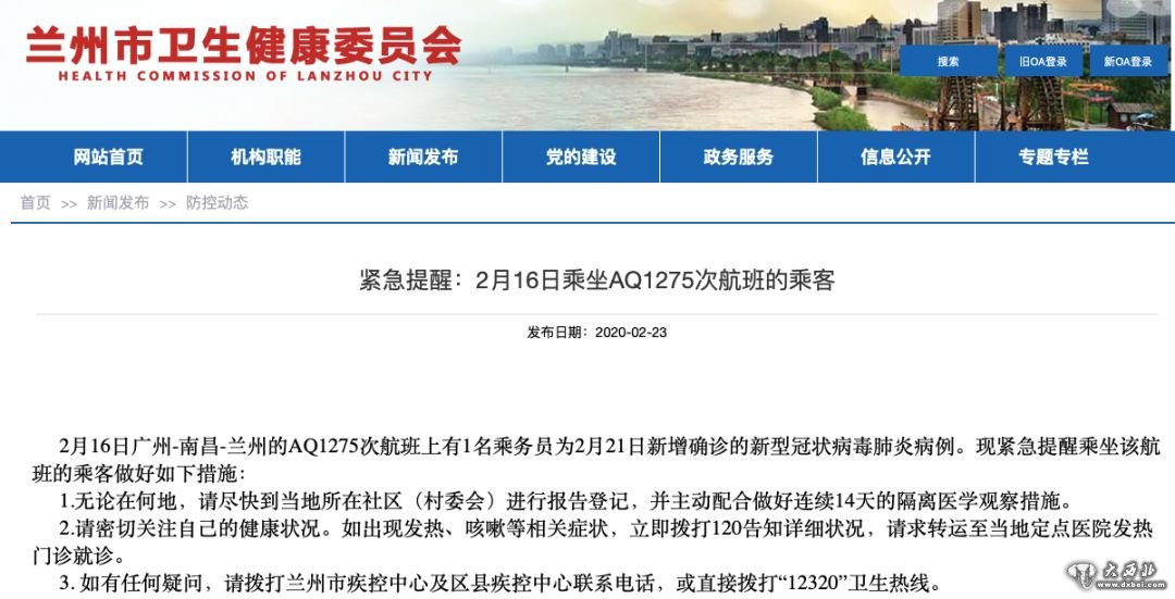 2月16日广州-南昌-兰州的AQ1275次航班上有1名乘务员为2月21日广东省新增确诊的新型冠状病毒肺炎病例。现紧急提醒乘坐该航班的乘客做好如下措施: