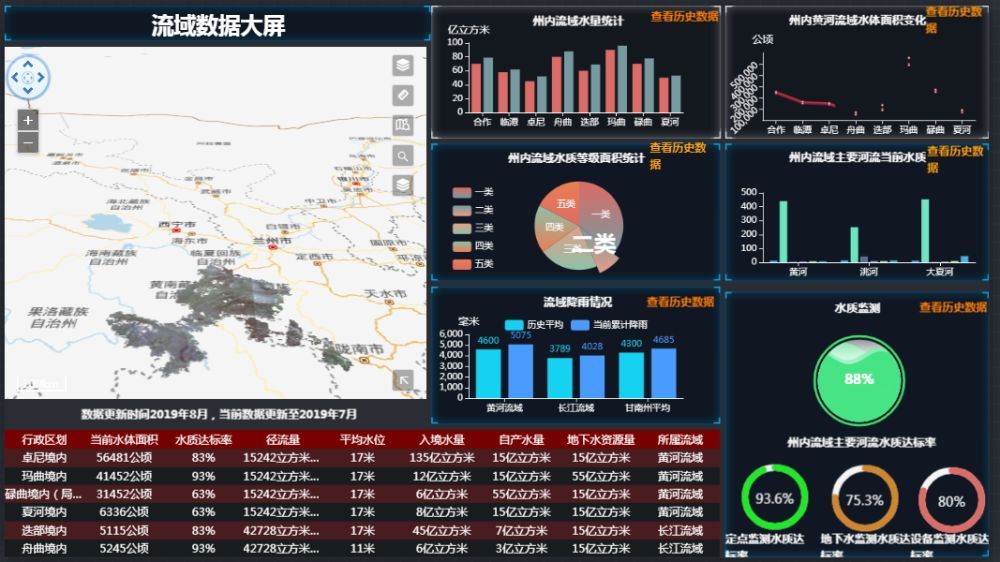 平台流域管理模块,针对甘南州境内黄河、洮河、大夏河、白龙江等主要流域建立全流域生态监测体系,向相关业务部门开放数据接口,整合汇总到大数据平台。可实现:各河流湖泊分布情况、流域水质水量的动态变化、各流域水体面积变化、各流域生态结构分析、各流域生态功能分析,水质、空气实时公开监测数据等展示。当水质没有达到标准时,系统会发出警报,根据流域监测数据,梳理没达标的指标并分析原因,为流域补偿提供科学依据。