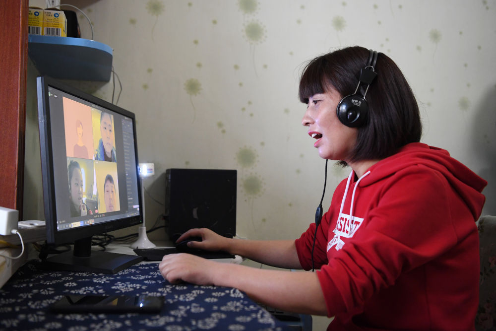3月9日,徽县实验小学老师马丽红在家中通过网络教学平台与学生互动。新华社记者陈斌摄